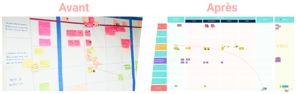 En effet, depuis plusieurs semaines, nous avions décidé de dédier un pan de mur à la matérialisation du travail quotidien de l’équipe technique à coup de ficelle, post-it, gommettes et sonnette. L’expérience étant un vrai succès, nous voulions pouvoir garder cette façon de faire très visuelle même en ces temps de crise. Notre chef de produit a donc recréé ce support via la plateforme Miro, qui est devenue un élément clé de notre télétravail. Intuitif pour que nous le prenions tous en main facilement à distance, et collaboratif, pour pouvoir travailler tous ensemble en même temps pendant les visios. Il nous a permis de maintenir une continuité dans notre organisation journalière.